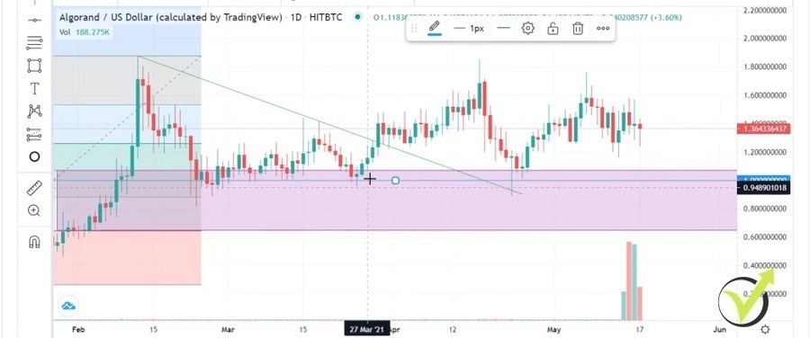 So when the Algo coin price does a retracement as it did right over here, I start to look for buying opportunities. I use counter-trendlines, I use some patterns, but at the current moment, you can see that the price is a little bit higher than this level. And as well, over here we have the $1 which is a round number because it’s the $1 and it always shows support or resistance for these cheap coins.