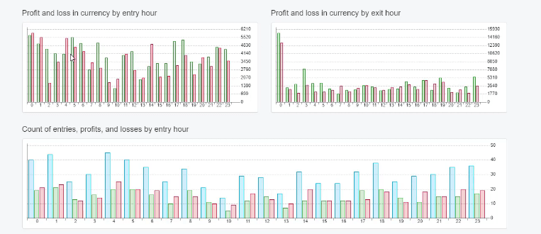 This strategy has most profit on Mondays and we have the profit and loss in currency by entry hour, profit and loss in currency by exit hour.