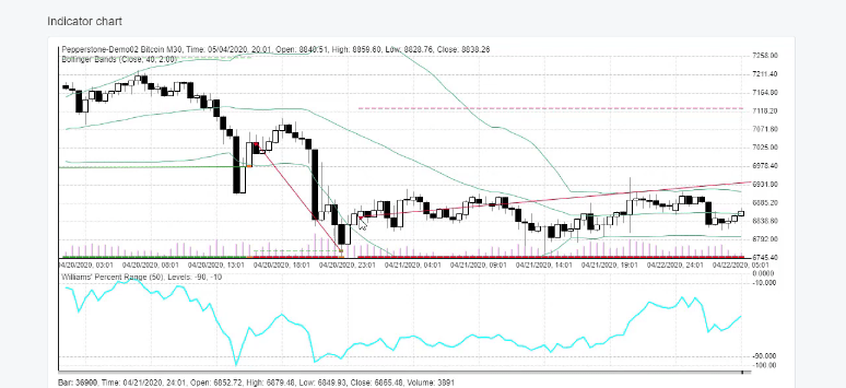 To make it clear, for this Bollinger Bands strategy, the exit condition is when the Williams Percent Range crosses the level line upwards, this is for the long trade. And for the short trade, we have the Williams Percent Range crosses the level line downwards.