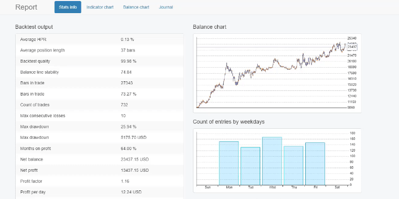 Considering that the Profit factor is calculated from the gross profits divided by the gross losses, any trading strategy that has Profit factor above 1 works great. In addition, as statistic, we have the count of entries by weekdays, so you can see it’s a balanced strategy.