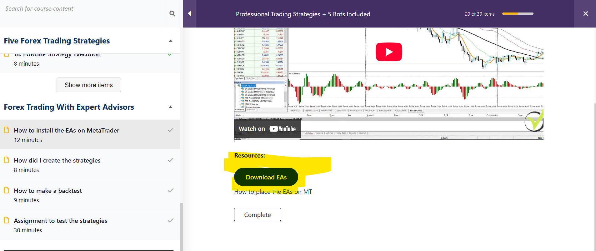In the 1st course of the program “Professional Trading Strategies + 5 Bots Included”, in the lesson “How to install the EAs on MetaTrader, the Link to Download the EAs is pointing on a “page not found”.