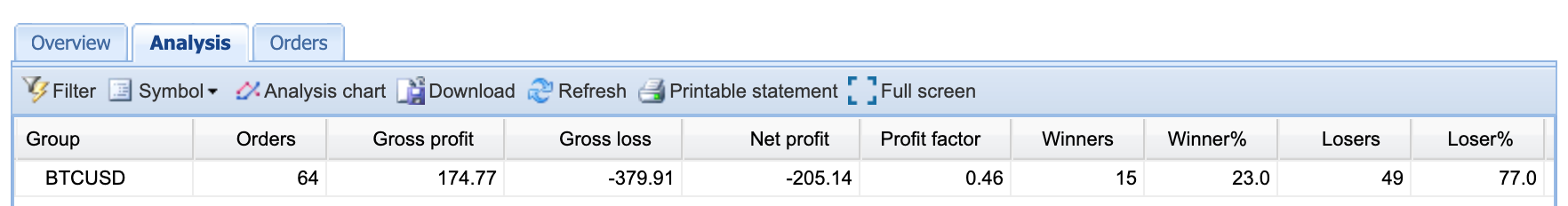 I know I’ve only been testing for 3 days and loss is always a part of trading but with 50 EAs running I was a little surprised to see that they are getting killed right now (77% losers). Even without picking only the winners, I thought that 50 EAs trading with edge was enough to see a positive profit. They seem to perform better when trading with the trend. Maybe that could be included with the strategy? They also seem to perform the worst when there is a price reversal, as seen yesterday at around 2.30 pm when BTC hit a low and bounced back. The EAs continued to open sell orders and with no SL the profits are relatively large now. As you say they will close the orders when the indicators tell them to, so it’ll be interesting to see how that plays out. I guess my question is how bad can this get, could it blow the account if the price just keeps going up and up? I apologise for my lack of understanding of how the entry/exit conditions are influenced by the associated indicators and would love any insight on how to evaluate that myself by looking at the EA properties so, in the future, I won’t need to bother you with so many questions!