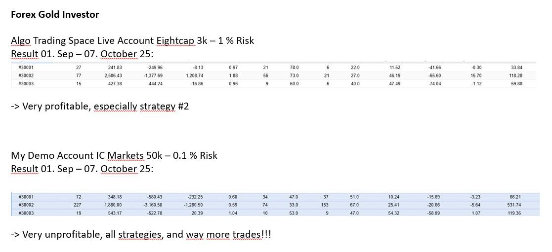 October 7, 2025 at 17:30 #473709Alesamo ParticipantHello, I just compared the performance of Forex Gold Investor on Algo Trading Spaces’ live account with mine, and I am shocked and absolutely clueless. I am also using FX Blue to track my accounts, and I saw that FGI recently was (again) quite profitable on Petko’s account, so I was wondering how this can be, as my trades for the same period (the period is 01 September until 07 October, i.e., today) are absolutely negative! I downloaded Petko’s .set file, and I am using exactly the same (default) settings, the only difference being the risk (I am using only a risk of 0.1% on my demo account) and that I did not use the randomization feature (which is activated in Petko’s .set file). I saw that there is a HUGE difference in the number of trades, my EA opened nearly 3 times more trades, especially and in particular for strategy #2 with magic #30002, and as Petko’s trades were very profitable, I have a very bad PF. See the pic attached – does anyhone have any idea how there can be such a huge difference???
