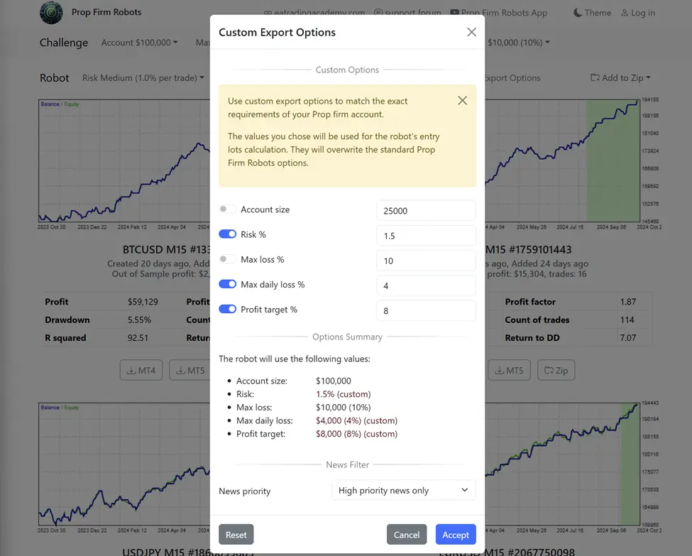 The Custom Export Options feature allows traders to assign unique identifiers, known as magic numbers, to their robots. This feature also enables customization of specific digits of these identifiers to create distinctive entries and exits for trades.