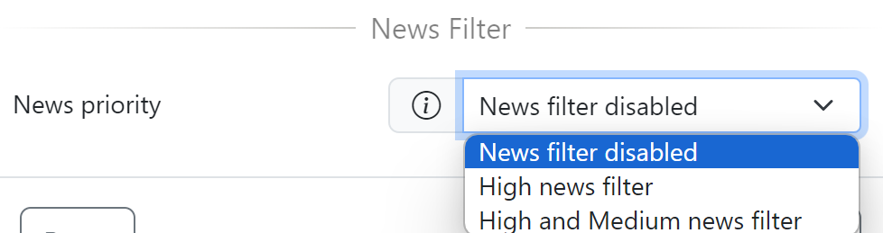 Prevents new entries during economic news events. If enabled, can be set to filter only High-priority news or both High and Medium-priority news. Available values are: News filter disabled, High news filter and High and Medium news filter.