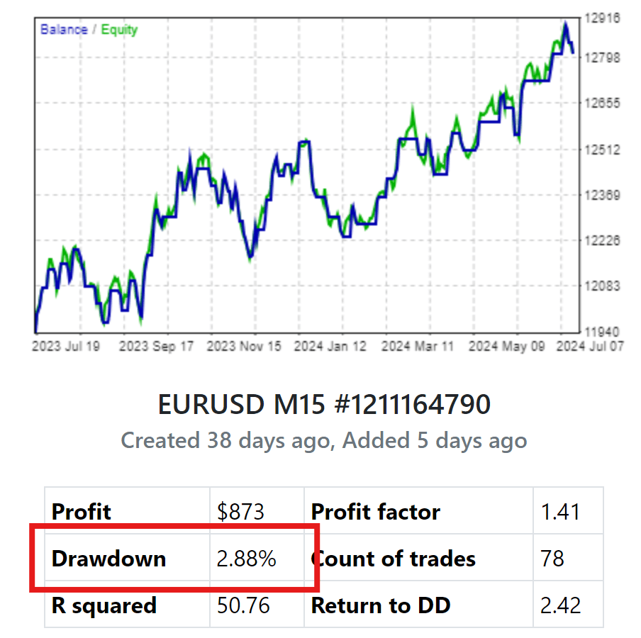 Shows the maximum drawdown experienced during the trading period, representing the peak-to-trough decline in account equity.