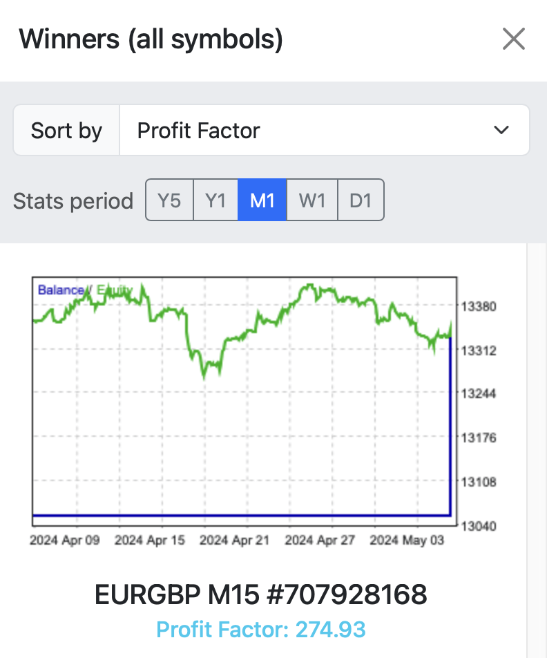 Description: Showcases the best-performing strategies across all symbols. Includes various sorting options based on metrics like Profit Factor and Count of Trades.