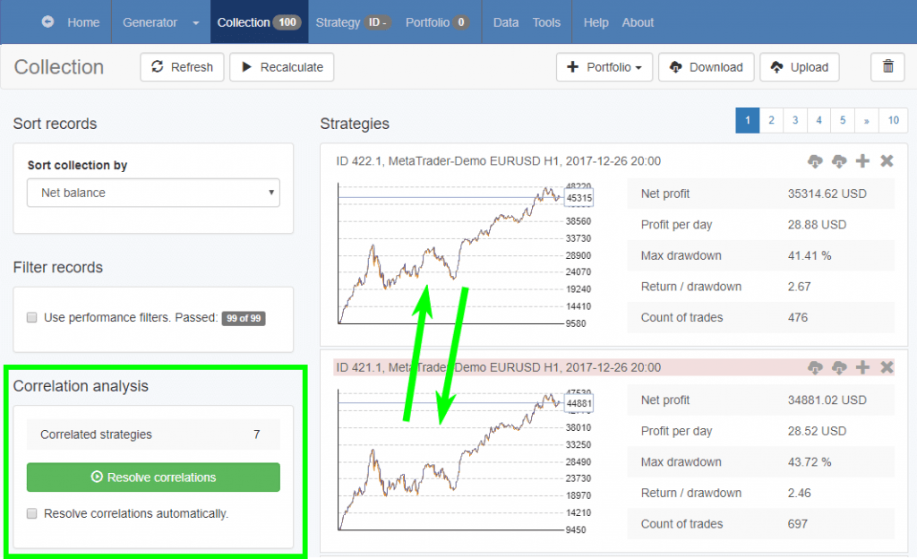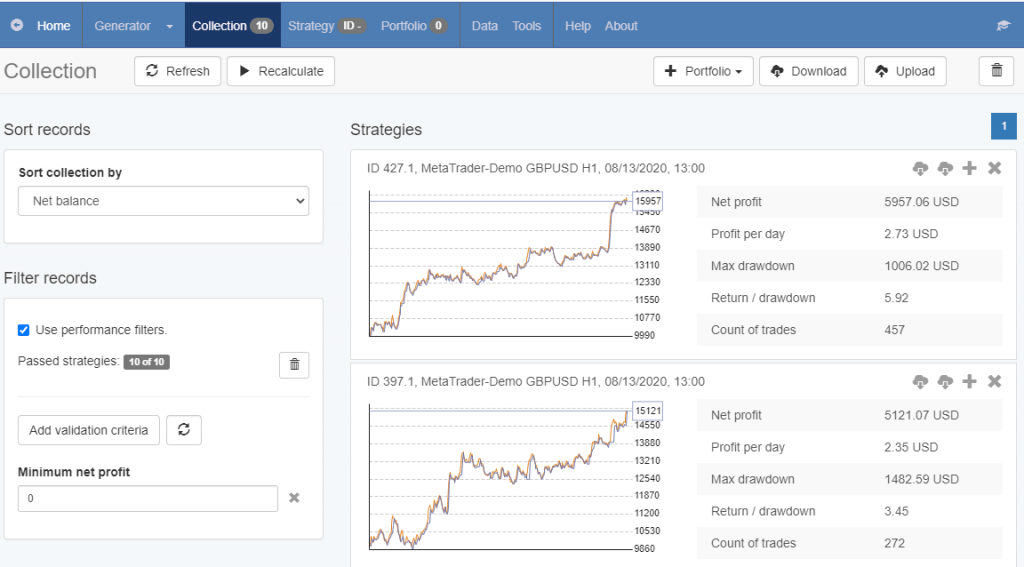 It sorts them according to the criteria that you have set. Let’s say that you are creating strategies with the Generator. In this case, some of them might be moved to the Collection.
