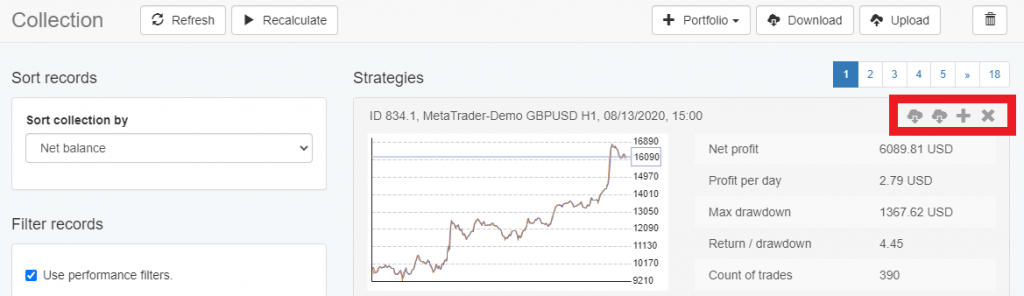 Refresh – the button refreshes the list of strategies. If you go to the Collection, you may notice that it always shows you the best ten strategies.