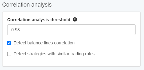 If the value goes beyond the default 0.98, then a strategy is correlated. In order to set the coefficient you need to go to Tools -> Settings -> Correlation -> Analysis.