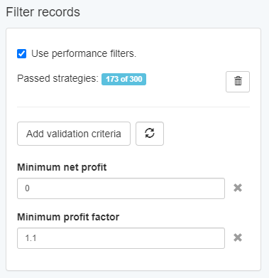 Add validation criteria – there are plenty of options that you can choose here. For instance: minimum profit factor, maximum stagnation days, maximum equity drawdown %, etc.