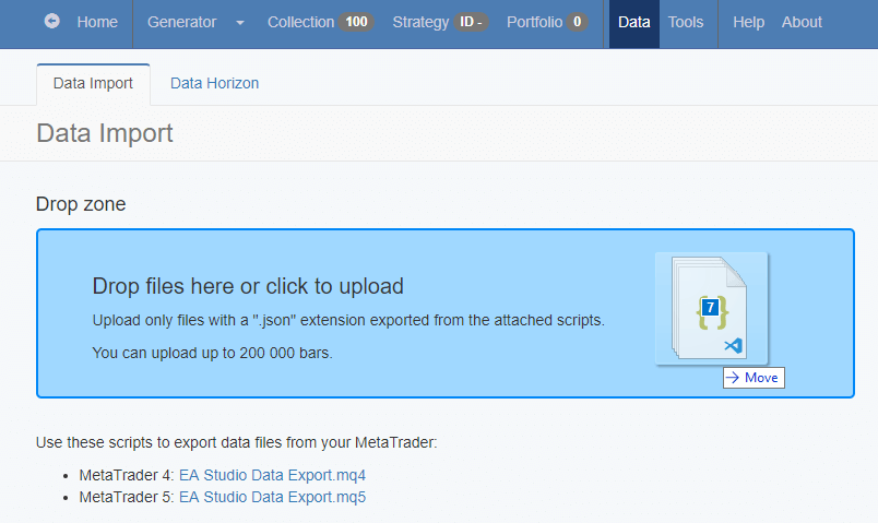 When you go to the Data Import page, there are two scripts (MQL) called “EA Studio Data Export”. One of them is for MetaTrader 4 and the other one is for MetaTrader 5. After you install such script in your trading platform, you can export its history data.