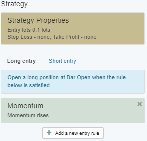 If we decide to choose the Momentum indicator as our entry rule and to add a logical rule to it, “Momentum rises” when its value becomes higher than the previous value, the requirement will be met. The strategy will open a long position.