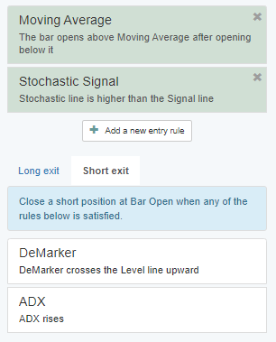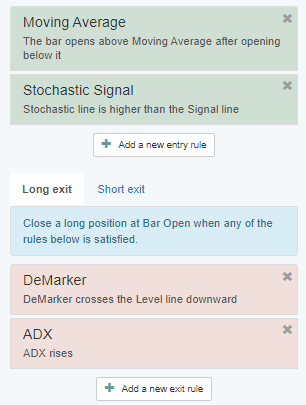 Go to the bottom section of the Strategy Panel and click on the “+ Add a new exit rule” button. It allows you to add up to two Forex exit indicators.