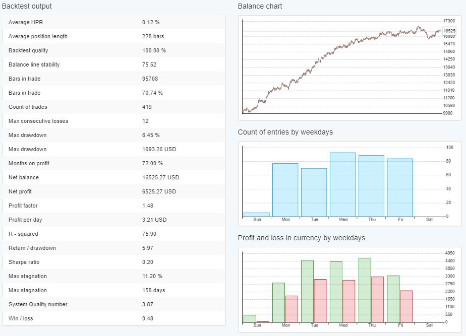 When the testing is completed you will see detailed statistics of the simulated trading.