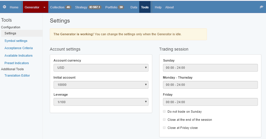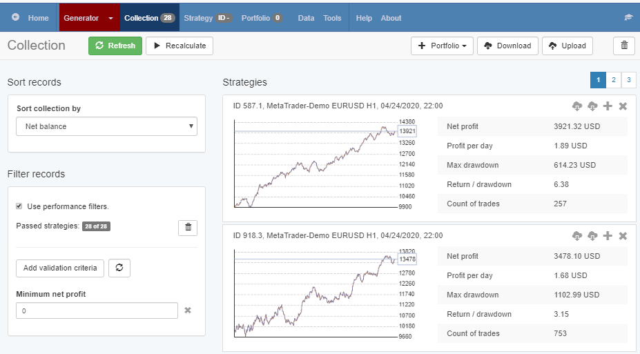 With the Generator, traders can create and test strategies automatically. The best strategies are being stored in the Collection section.