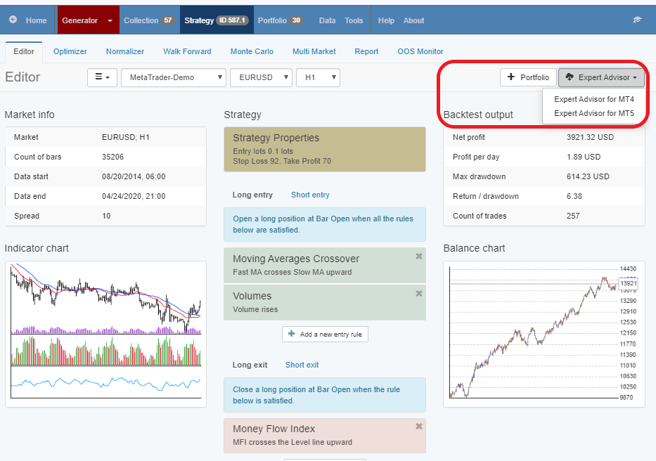 You can “Edit” the generated strategy in the Editor. There you can review the strategy indicators and parameters and you can export Expert Advisors for MT4 or MT5.