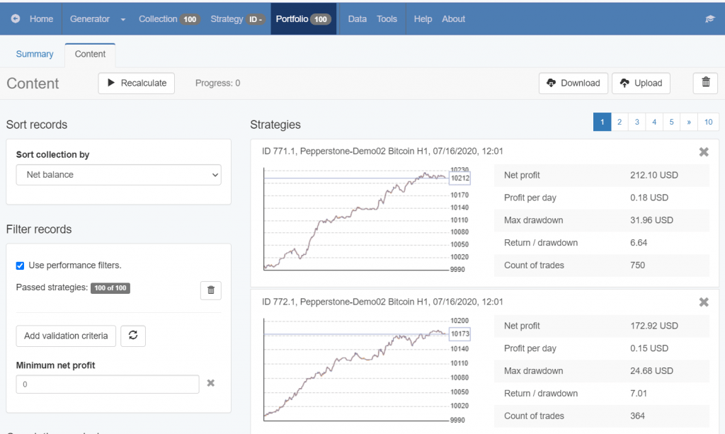 The second tab of the Portfolio page is the ‘Content tab’ and it displays the portfolio strategies. It provides you with many useful options. For instance, you can sort, filter, and recalculate any strategies, or remove the ones that are correlative.