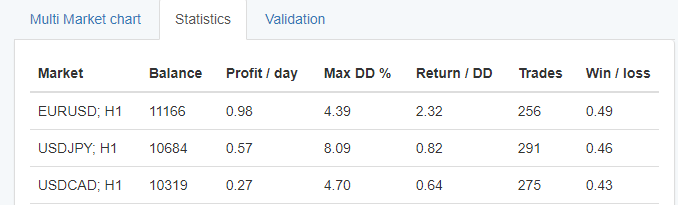 The Statistics tab provides the traders with key backtest information for each of the tested markets.