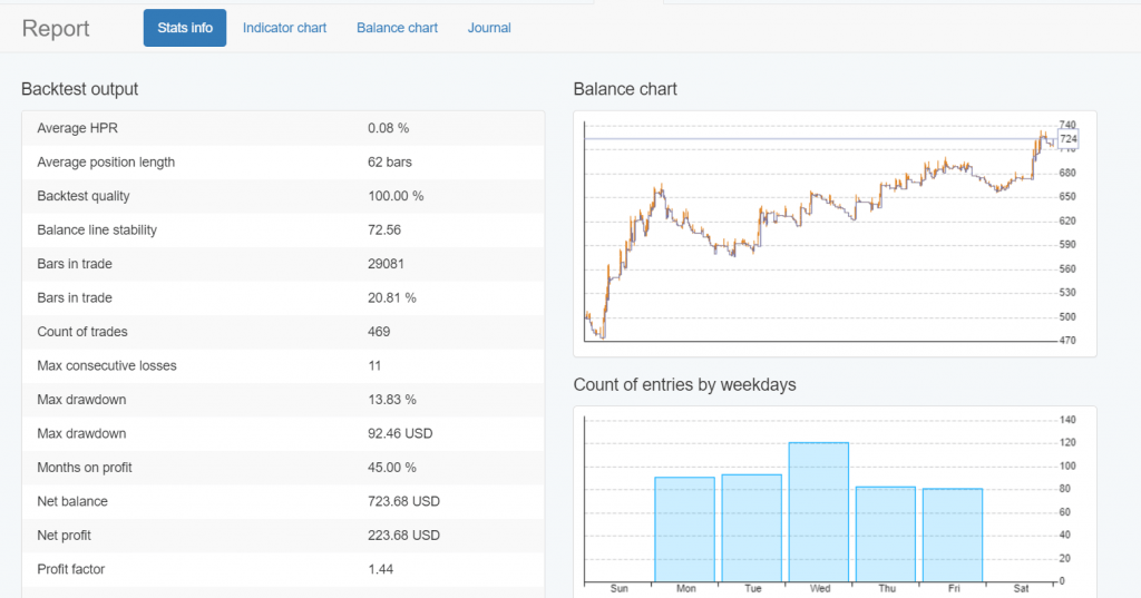- Report – it provides you access to every single trade made during the backtest together with very detailed information presented with statistics and charts. This is a complete report of this Forex trading simulator.