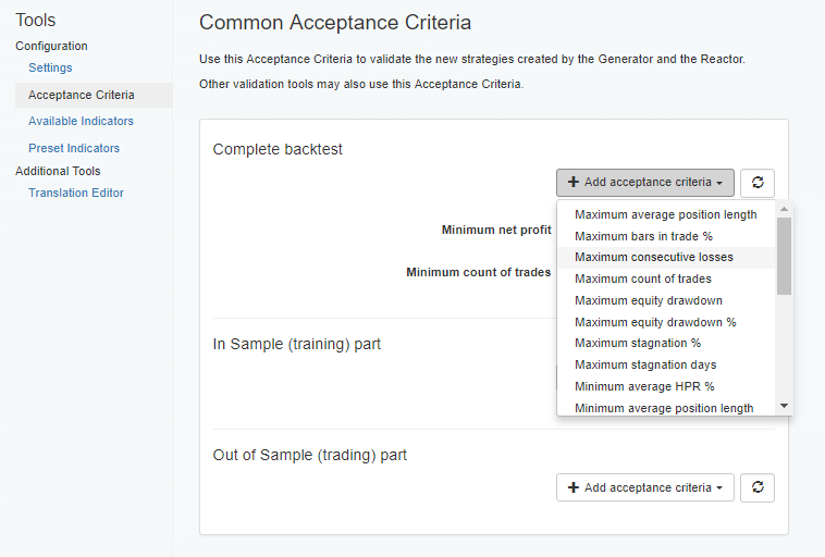 In order to check what the strategy’s backtest looks like, simply visit Strategy/OOS Monitor, and then add the preferred values in the acceptance criteria settings. Of course, they will be applied to the new strategies.