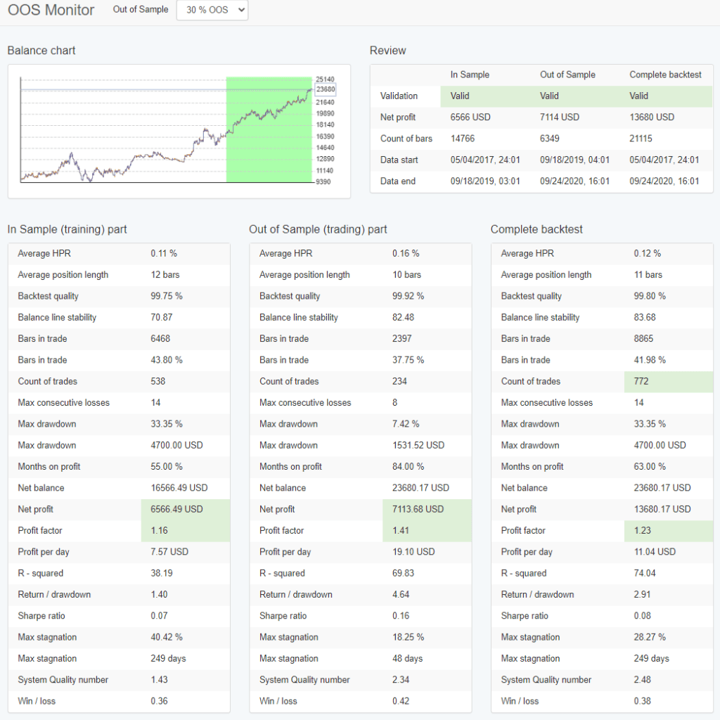 In order to view the backtest results of your strategy, go to Strategy/OOS Monitor tab or click on the Strategy/Report tab. Our advise is to use the OOS Monitor because it provides you with separate statistics of the three zones.