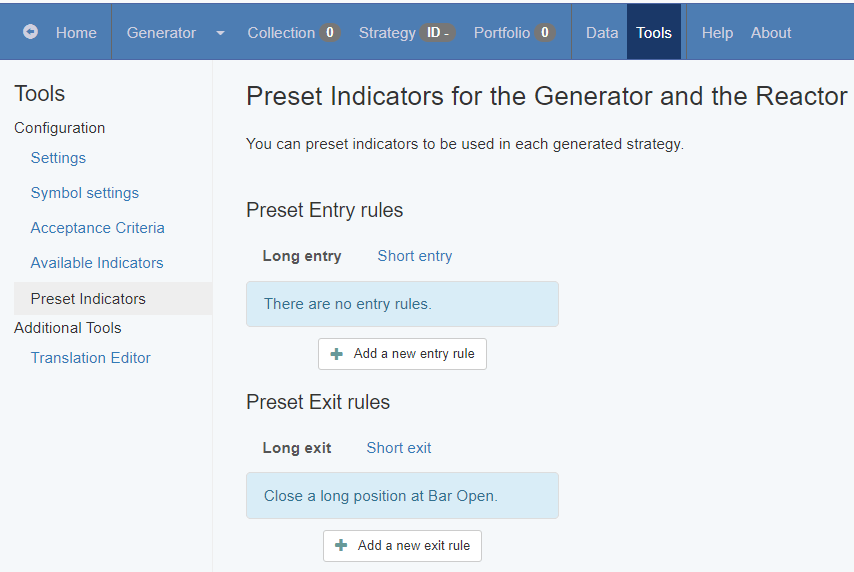 If you activate “The strategies use Preset Indicators” option in the Generator page, all the new strategies will use them first.