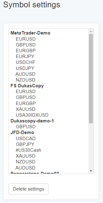 There are two panels on the Settings page – Symbols List and Symbols Setting for the active symbol.